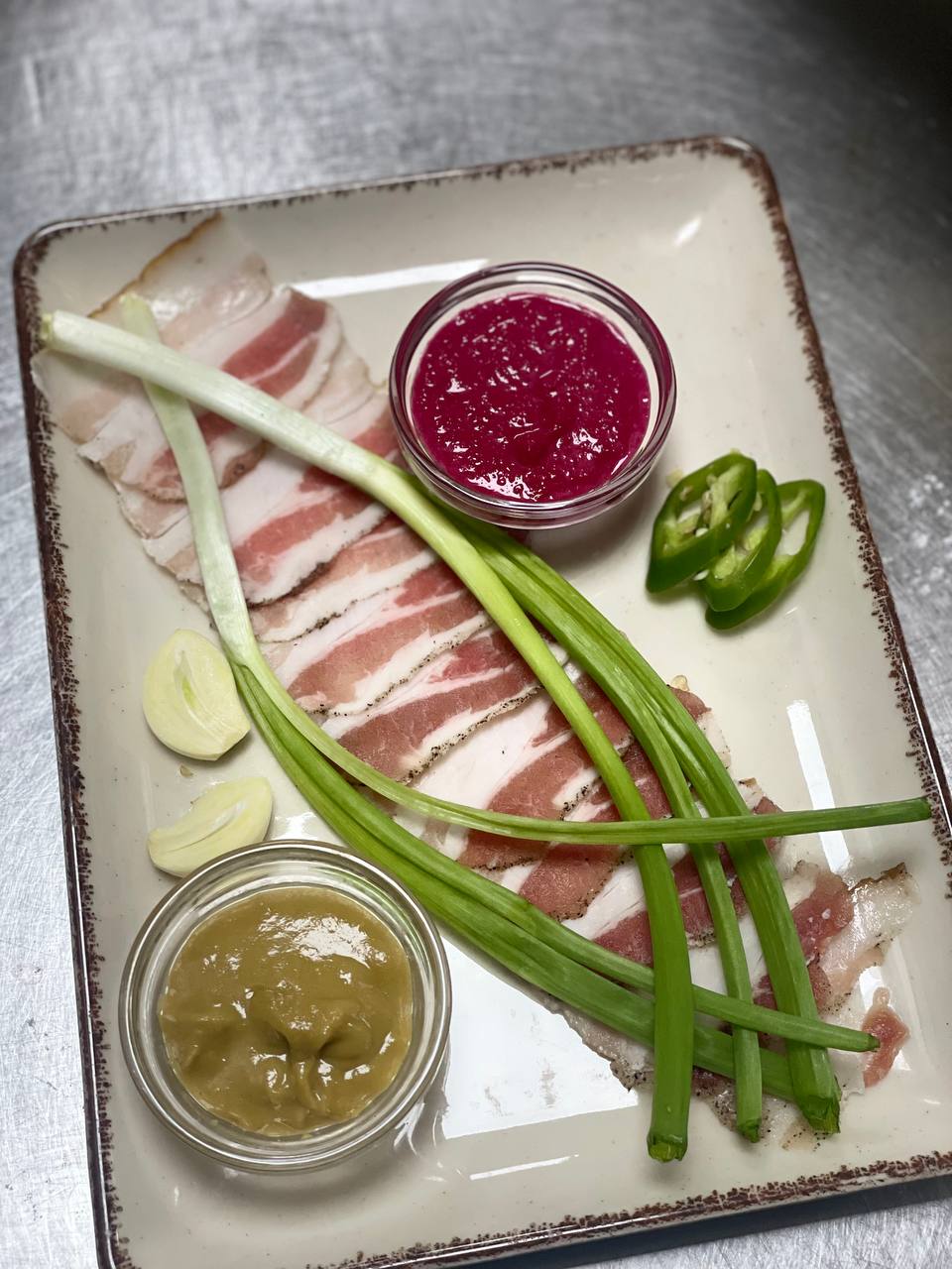 Куряче яйце, Червона Квасоля, Грудинка, Мікс Салату, Мисливські ковбаски, Помідорки Черрі, Хліб.