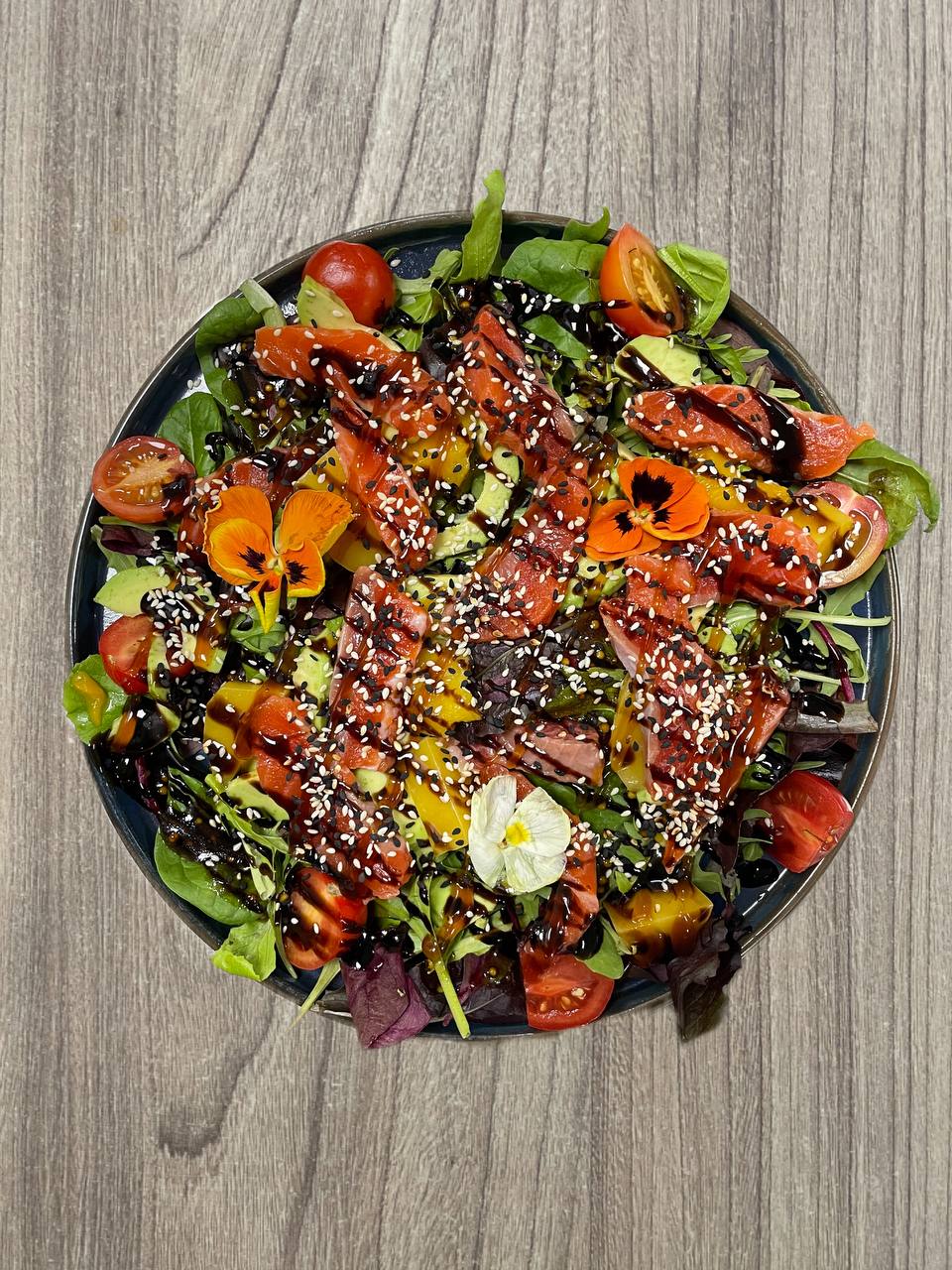 Мікс салату, ніжний лосось, манго, авокадо, помідор Черрі, фірмова салатна заправка, соус Унагі, бальзамічний крем, кунжут.
